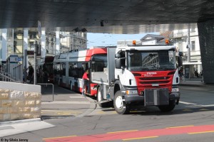 Am 8.9.2010 machte der neue Swisstrolley 3 Nr. 104 am Hauptbahnhof keinen Wank mehr. er musste darauf hin mit dem Mercedes-LKW ins Depot geschleppt werden. |