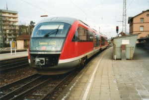 642 114 am bereits sanierten Bahnsteig in Hilpoltstein im Dezember 2001. Die Strecke Roth - Hilpoltstein - Thalmässing - Greding wurde am 01.06.1888 in Betrieb genommen. Der Personenverkehr wurde auf dem Abschnitt Thalmässing - Greding am 28.05.1972 und auf dem Abschnitt Hilpoltstein - Thalmässing am 29.09.1974 eingestellt. Bis Ende September 1998 verkehrte auf dem Abschnitt Hilpoltstein - Thalmässing noch eine Museumsbahn, doch nachdem zum 31.12.1997 auch der Güterverkehr auf diesem Abschnitt eingestellt worden ist, musste auch die Museumsbahn ihren Betrieb dort einstellen. Anschließend wurden die Gleise abgebaut und der Bahnhof Hilpoltstein zum Haltepunkt zurück gebaut. Dabei wurde auch der Bahnsteig saniert und so umgebaut, dass die Anschlussbusse bis an den Bahnsteig ranfahren können, so dass jetzt direkt zwischen Bus und Bahn umgestiegen werden kann. |