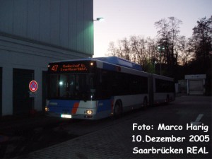 Zu sehen ist der Niederflurgelenkbus des Typs NG 313 der SaarBus GmbH mit der Betriebsnummer US 275 |