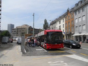 Ab 4.7.2012 bis ca. Juni 2013 wird der Bahnhofplatz von Winterthur vollständig umgebaut, während dieser Zeit wurde die Linie 1 und 2 zusammengelegt, so entstand eine Linie Oberwinterthur - HB - Wülflingen und Seen - HB - Töss. Der hier zusehende Swisstrolley erreichte den HB als 2er aus Seen, und wird nun als 1er nach Töss fahren. So kann die Baustelle umfahren werden, jedoch entstehen für die Passagiere längere Umsteigewege. |