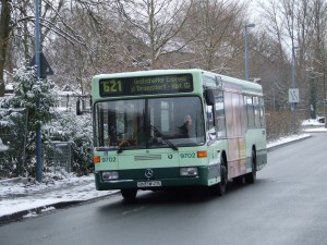 Auf der Gelenkbuslinie 633 ohne Gelenkbus im verschneiten Oedekoven. |