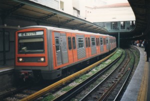 MAN-Zug der 2. Serie (erkennbar an den Übersetzfenstern) als HVZ-Verstärker in Eirini. Die HVZ-Verstärker fahren nur bis Eirini und fahren nach kurzer Kehrzeit auf dem mittleren Gleis nach Peiraia zurück. Die beiden äußeren Gleise sind für die Stammzüge von und nach Kifissia.