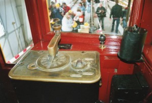Führerstand der Baureihe BII. Der Fahrschalter ist hier noch handbetätigt wie bei den Baureihen AI, AII, BI und Hamburger T-Wagen ausgeführt.