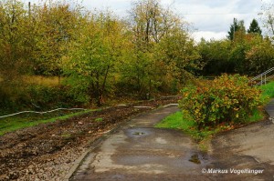 Rechts die ehemalige Schleifeneinfahrt der Wendeschleife "Merkenich" und links die neue Gleisverbindung mit Blick auf das Wendegleis der Linie 12 (rechts) in der Wende und Abstellanlage "Merkenich" am 28.10.2013. |