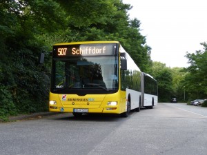 Hier sieht man den leuchtenden 1121, ein Mercedes-Benz Citaro G im Metro-Design, an der Bahnhofstraße in Bremerhaven. Der Bus wurde wegen des EBSF-Projekts mit einigen Besonderheiten ausgestattet. So zeigen Leuchten in den Türen die Ein- und Ausstiege an, Leuchten über den Sitzen zeigen, ob dieser frei oder besetzt ist und Steckdosen ermöglichen bspw. das Smartphone aufzuladen. |