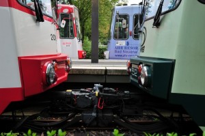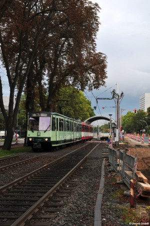 in Königswinter, kurz vor der Haltestelle Clemens-August-Straße am 20.09.2014 bei der Sonderfahrt Gemischte Doppeltraktion KVB+SWB. |