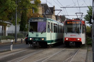 Am 20.10.2014 in der Haltestelle Königswinter, Clemens-August-Straße. Der Zug aus 7466 und 7577 hatte offenbar eine Türstörung. Jedenfalls fuhr er über 10 min lang nicht ab. Sein Fahrer sprang zwie mal heraus und lief am Zug entlang, um die Türen zu drücken. Auf dem Foto sind die Stromabnehmer des nachfolgenden Zuges zu erkennen. Dessen Fahrer (der Herr in rot) seinem Kollegen zu helfen versuchte. Tatsächlich konnte die Fahrt bald darauf fortgesetzt werden. |