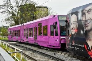 Niederflurwagen 4081 wurde die KVB-Eigenwerbung "KVB Abo plus" entfernt. Momentan ist er in seinem violetten Basislack im Netz anzutreffen. Hier zu sehen auf der Neusser Straße am 29.11.2014. |