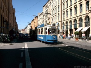 Oben fährt die Tram. Unten fährt die U-Bahn. Dazwischen steht dieser Nachbau einer der ersten Münchner Bahnen. |