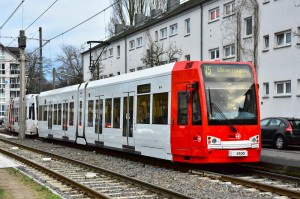 Niederflurwagen 4100 hat eine Neulackierung in die aktuellen KVB-Farben erhalten. Hier zu sehen auf der Kreuzung Neusser Straße/Wilhelm-Sollmann-Straße am 29.01.2015. |