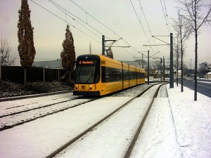 Auf SL2 fährt er durch das weißverschneite Gleisvorfeld am Straßburger Platz. |