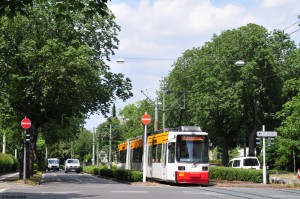 diese kleine grüne Insel lässt sich kurz vor der Haltestelle Pariser Tor finden. Rechts schön gepflegte Blumenbeete, Rasengleis...