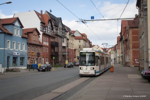 Der Zug der Linie 1 hat gerade die Endhaltestelle Zwätzen verlassen und schwenkt nach einem kurzen Stück mit eigenem Gleiskörper in die Naumburger Straße ein, wo er auf der eingleisig in Seitenlage trassierten Strecke dem Autoverkehr entgegen kommt. Dieses Manöver erfolgt komplett ohne Absicherung durch eine Ampelanlage. |