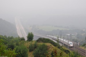 ein ICE3 auf dem Weg in Richtung Köln. Der Zug ist stolze 200 Meter lang. In der Landschaft wirkt er allerdings winzig...