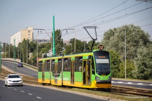 Düwag GT8 ex Rheinbahn Düsseldorf Mit aktuell 43 Fahrzeugen einer der am häufigsten anzutreffenden Wagentypen in Posen. Der Wagen ist hier im Rundfahrgleis der großzügig angelegten Endschleife der 2012 eröffneten Strecke nach Franowo als Reservefahrzeug abgestellt. Dort befindet sich auch ein großer Betriebshof. |