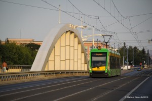 Dieser Düwag GT8 ist sogar noch in Rheinbahnfarben unterwegs und fährt hier gerade in die Haltestelle Piaśnicka/Rynek ein. Beide Haltestellen im kurzen Tunnelstück der Strecke nach Franowo sind gleich gestaltet und nach oben offen. |