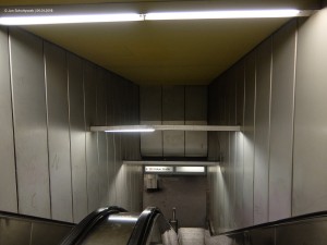 Die Verteilerebene zur U9 (und U10). Die Bauarbeiten haben hier schon angefangen, früher war die komplette Decke mit diesen gelben Kreisen abgehängt. Die Ebene wird komplett umgebaut, was dringend nötig ist, denn sie ist extrem unübersichtlich konstruiert: Eigentlich war sie ja so geplant, dass man hier von der U9 zur U10 umsteigen kann. Da die U10 aber nie gebaut wurde, gibt es einen Haufen "tote Ecken" und Korridorstümpfe, die an schwarzen Blechwänden mit leeren Vitrinen (für die U10-Fahrpläne) enden - in diesem Gängewirrwarr den Weg zum Busbahnhof zu finden, kann schon mal ein paar Minuten dauern. Das hat die BVG schon sehr früh erkannt und ließ einen Teil der Korridore schon Ende der 80er schließen, bis vor wenigen Jahren präsentierte sich dieser Teil somit komplett mit alten Beschilderungen im Zustand von 1988. |