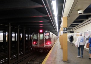 Das ist ein R160, einer der jüngsten Züge der NYC Subway. Sie gehören zu den sogenannten "New Generation Trains" , wurden zwischen 2000 und 2008 von Alstom und Kawasaki gebaut und meistens sind sie auf der C, E, F, N und Q unterwegs. Für die MTA sind sie tatsächlich erstaunlich modern, immerhin verfügen sie über Drehstrommotoren, automatische Ansagen und digitale Perlschnüre. Und sie werden per Sollwertgeber gesteuert, nicht per Handrad. |