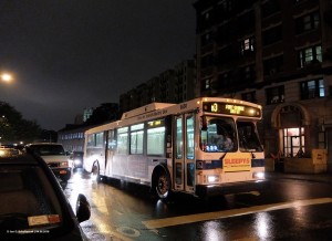 Fährt als umgeleitete M20 am Busbahnhof vorbei in den Sonnenuntergang hinein. |