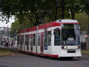 Innenansicht des Fahrzeugheckes. Gut zu erkennen: Der Niederflurteil des Fahrzeuges ganz unten, dann die erste Erhöhung über dem angetriebenen Drehgestell, und am Fahrzeugheck eine weitere Erhöhung wegen der Kupplung. |