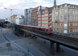 Das hat der DT5 schon gar nicht mehr miterlebt: Früher konnte man hier frei auf die U-Bahn herunterschauen, heute steht hier das Gebäude der "Hamburg School of Business Administration", das nur eine kleine Lücke im linken Gebäudeteil zum Gucken übriglässt.