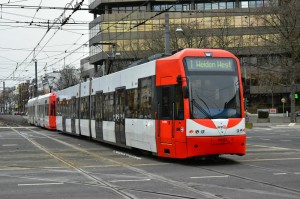 Niederflurwagen 4539 wurde eine neue Ganzgestaltung zum Jubiläum "150 Jahre Kölner Bank eG" angebracht. Hier zu sehen auf der Kreuzung Wilhelm-Sollmann-Straße/Neusser Straße am 09.01.2017. |