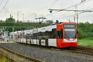 Niederflurwagen 4528 wurde eine neue Ganzreklame "Helvetia Versicherung" angebracht. Hier zu sehen auf der Wilhelm-Sollmann-Straße am 19.07.2017, |