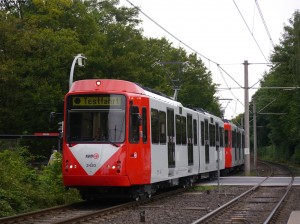 Der 12. fertig sanierte B-Wagen 2403 (ex 2103) während seinem ersten Liniendienst auf dem Barbarossaplatz am 25.08.2017. |