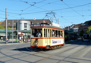 Bei der Bremer Straßenbahn gibt es ein neues Museumsfahrzeug. Es handelt sich um Tw 557 (ex 3557), einen Wegmann GT4f von 1977. Ca. 2011 schied das Fahrzeug aus dem Liniendienst aus und wurde grundlegend überholt und in den Altlack umlackiert um seit Anfang November 2017 nun wieder Fahrgäste befördern zu dürfen. Am vergangenen Sonntag, den 12.11.2017, wurden Fahrten zwischen Sebaldsbrück und Weserwehr angeboten, wo dann auch dieses Bild entstand. Ein passender Beiwagen (747) ist noch zur Aufarbeitung abgestellt. |