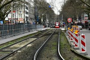 Im Hintergrund die provisorischen Hilfsbahnsteige (Zülpicher Platz) für Karneval 2018 vom Barbarossaplatz aus gesehen. |