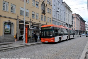 Am 14.05.2018 ist der O-Bus 8199 auf der Linie 2 in Richtung Sentrum und erreicht in wenigen Augenblicken die Endstelle Strandkaiterminalen. |