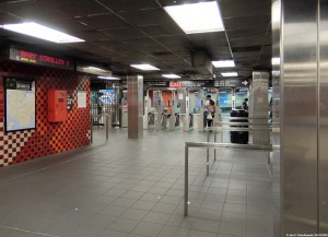 Selbstverständlich passt auch das Sperrengeschoss absolut ins architektonische Bild, sieht aber noch etwas besser aus, was den Zustand angeht. Auffällig ist, dass es keine normalen Drehkreuze gibt, sondern nur die drehenden Trenngitter die Glaswand unterbrechen. Hinten kann man den aus Fliesen zusammengesetzten Schriftzug "SUTPHIN BLVD" erkennen. |