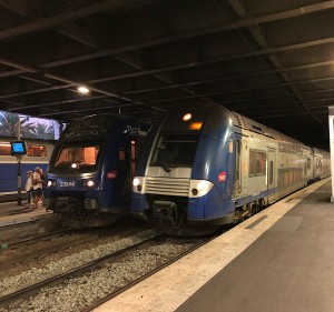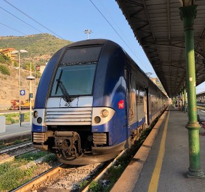 Normalerweise sind die Züge der TER Provence-Alpes-Côte d'Azur immer blau-grau und mit dem regionalen Wappen versehen. Allerdings gibt es auch Züge, die Monaco "bewerben" und in den monegassischen Farben rot und weiß gehalten sind. |