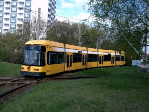 Die Bahn hält zum wenden, während sie durch den Bus überholt wird. |