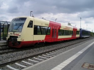 Hier ein Zug der HZL und ein Zug der BOB in Friedrichshafen Stadt. Wegen Fahrzeugmangel hilft die HZL zur Zeit bei der BOB aus wie man sehen kann. |