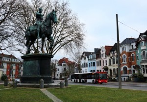 Die Buslinie 22 ist eine Tangentiallinie: Von der Uni geht es über Schwachhausen, Hulsberg, und Habenhausen bis nach Kattenturm. Dabei wird, mit Ausnahme der 5, jede Straßenbahnlinie gekreuzt. Für den Sprung über die Weser nutzen die Busse die chronisch überlastete Erdbeerbrücke, wie die Karl-Carstens-Brücke im Volksmund genannt wird. Solche Fotos sind daher eigentlich nur sonntags möglich.